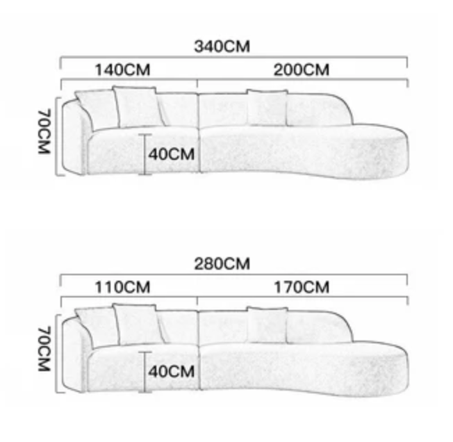 7 seater: L340 x W85/160 x H70cm (2 modular unit)